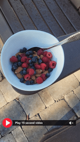 Picking Service Berries from a bush right beside my morning coffee chair.  And putting them on top the raspberries I just picked from the orchard.  Loving my favorite spot- right where I am, right when I am.